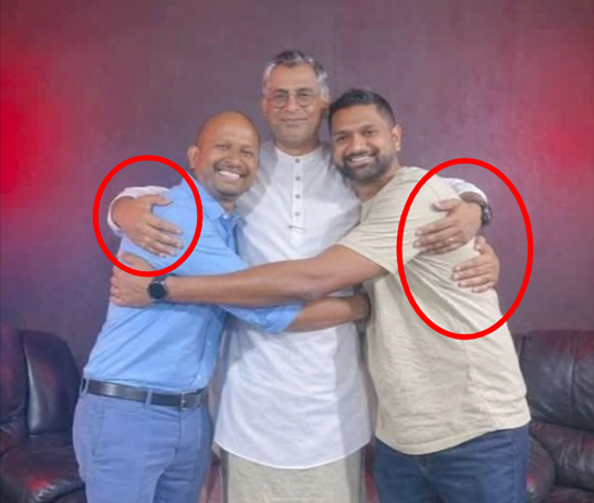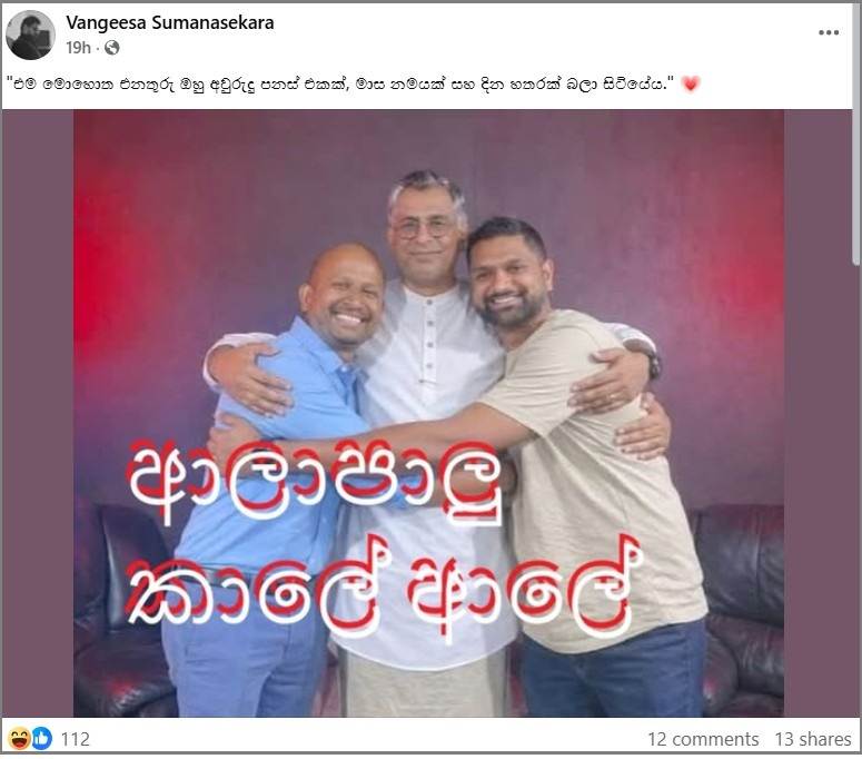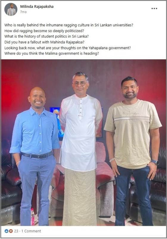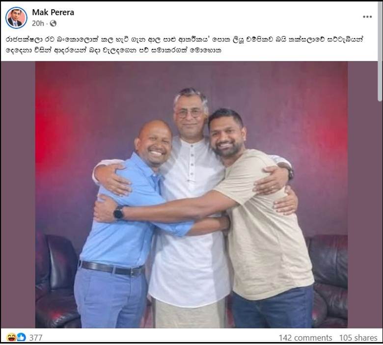 ‘රාජපක්ෂලා රට බංකොලොත් කල හැටි ගැන ආල පාළු ආර්තිකය‘ පොත ලියූ චම්පිකව බයි තක්සලාවේ සට්ටැබියන් දෙදෙනා විසින් ආදරයෙන් බදා වැලදගෙන පව් සමාකරගත් මොහොත’ යනුවෙන් සඳහන් කරමින් පළ කර ඇති පහත ඡායාරූප සටහනට අනුව පොදුජන පෙරමුණේ හිටපු නාගරික මන්ත්රීවරයෙකු වන මිලින්ද රාජපක්ෂ සහ ගායක ඉරාජ් වීරරත්න විසින් පාඨලී චම්පික රණවක මහතාව වැළඳගෙන දැඩි සුහදත්වයක් දක්වන ආකාරයක් දැකගත හැකියි.