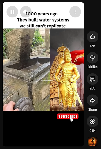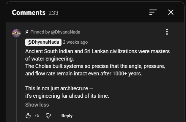 අතීත දකුණු ඉන්දියානු සහ ශ්රී ලංකා ශිෂ්ටාචාරවල විශ්මිත ජල පද්ධති නිර්මාණය කිරීමේ හැකියාව තිබු බව පවසමින්, ඉපැරණි චෝල අධිරාජ්යයන් විසින් ඔවුන්ගේ නිර්මාණ හැකියාවන් සහ තාක්ෂණය යොදාගනිමින් මීට වසර 1000කටත් පෙර ඉදිකරන පුරාණ ජල කරාමයක් අදටත් නිසි ආකාරයෙන් ක්රීයාත්මක වන ආකාරයක් ලෙස දක්වමින්, ඉංග්රීසි බසින් ඉන්දීය පාඨකයින් ඉලක්ක කරගනිමින් ටියුබ් පළවූ වීඩියෝවක් පහතින්. එසේම මෙම ජල පද්ධතියේම වීඩියෝවක් ෆේස්බුක් හරහා පල කර තිබුණේ සීගිරිය ආශ්රිත ජල පද්ධතියක් ලෙස දක්වමින්.