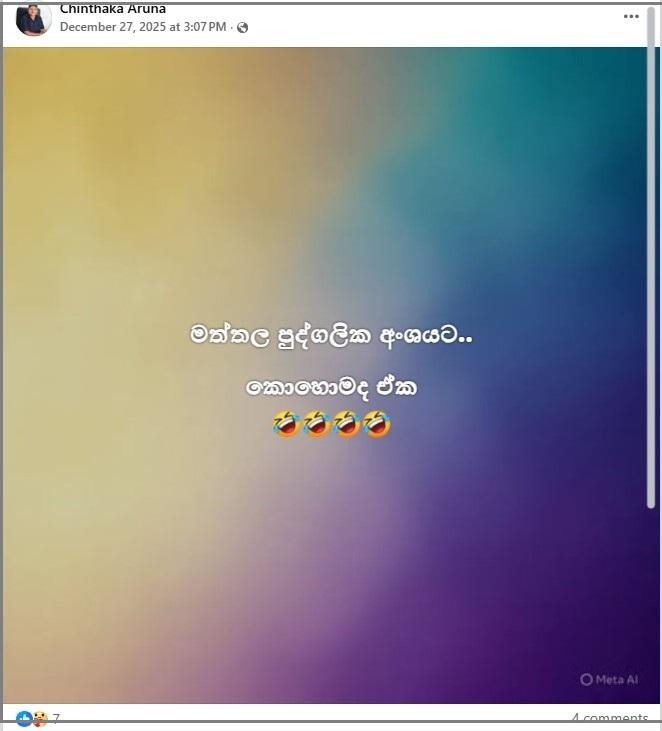 මත්තල ජාත්‍යන්තර ගුවන් තොටුපොළ පෞද්ගලික අංශයට ලබාදීමට සූදානම් වන බව කියමින් ෆේස්බුක් සටහනක් පළ කර තිබුනේ මෙලෙසින්. කෙසේ වෙතත් ඒ පිළිබඳව ඊට එහා ගිය කිසිදු විස්තරයක් මෙම සටහනේ ඇතුළත්ව නොමැත.
