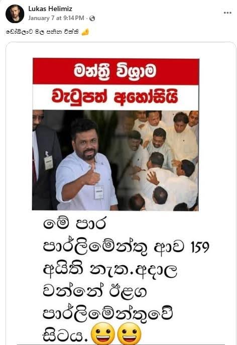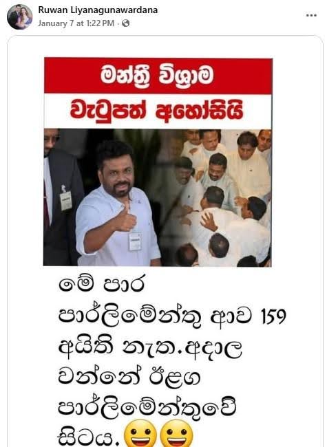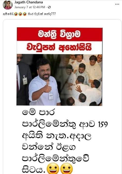 මන්ත්රී විශ්රාම වැටුප අහෝසි කිරීමට අදාළව සංසරණය වන මෙම සටහන සත්ය යැයි සිතා බෙහෝ පිරිසක් අදාළ ඡායාරූප සටහන් සිය ෆේස්බුක් ගිණුම් හරහා ද මෙලෙස හුවමාරු කර ගෙන තිබුණා.