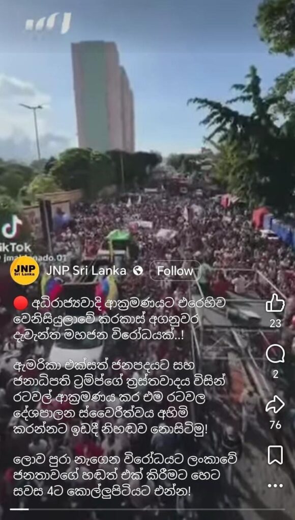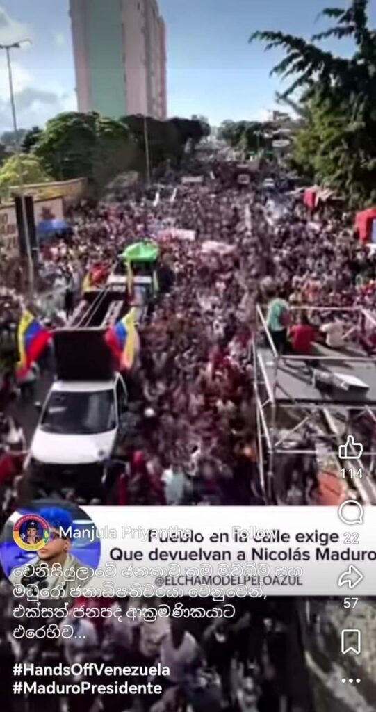 “අධිරාජ්‍යවාදී ආක්‍රමණයට එරෙහිව වෙනිසියුලාවේ කරකාස් අගනුවර දැවැන්ත මහජන විරෝධයක්” යනුවෙන් සඳහන් කරමින් ද අදාල වීඩියෝව සමාජ මාධ්‍ය තුළ හුවමාරු වී තිබුණේ මෙලෙසින්.