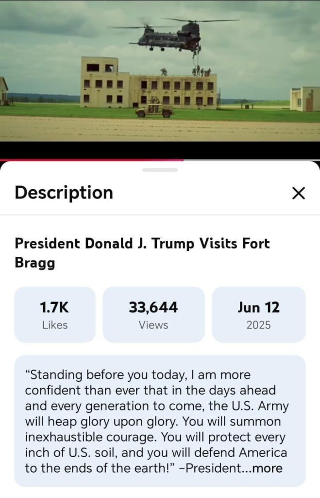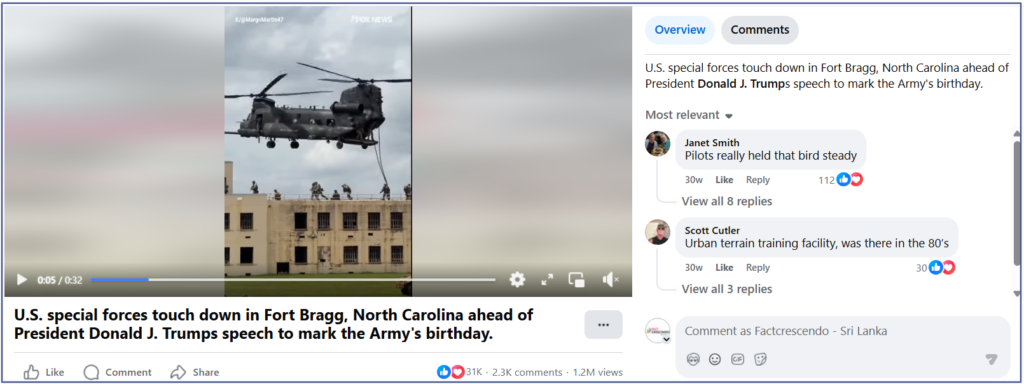 ඒ අනුව අදාල වීඩියෝව පසුගිය වසරේ ජූනි මාසයේදී ඇමරිකා ජනාධිපති ඩොනල්ඩ් ට්‍රම්ප් උතුරු කැරොලිනාවේ ෆෝර්ට් බ්‍රැග් වෙත කළ සංචාරයේදී සිදු කළ හමුදා අභ්‍යාසයක් පෙන්වන පැරණි වීඩියෝවක් බව තහවුරු වනවා.