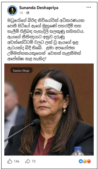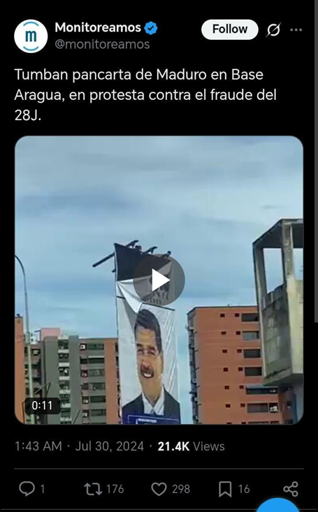 2024 ජූලි මස 30 පල කරන ලද X සටහනක ද “ජූලි 28 වංචාවට විරෝධය පළ කරමින් බේස් අරගුවා හිදී ඉරා දැමූ මදුරෝ ගේ බැනරයක්” යනුවෙන් සඳහන් කරමින් අදාල වීඩියෝව පල කර තිබුණා.