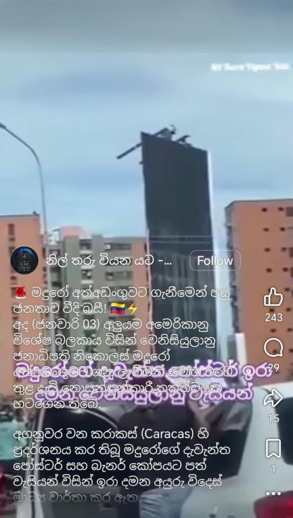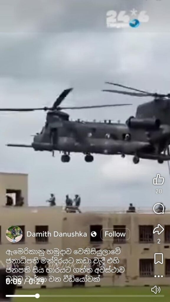 ඇමරිකානු හමුදාව වෙනසියුලාවේ ජනාධිපති මන්දිරයට කඩා වැදී එහි ජනාධිපතිවරයා සිය භාරයට ගත් අවස්ථාව දැක්වෙන වීඩියෝවක් බව සඳහන් කරමින් වීඩියෝවක් සමාජ මාධ්‍ය තුළ හුවමාරු වී තිබුණේ මෙලෙසින්.
