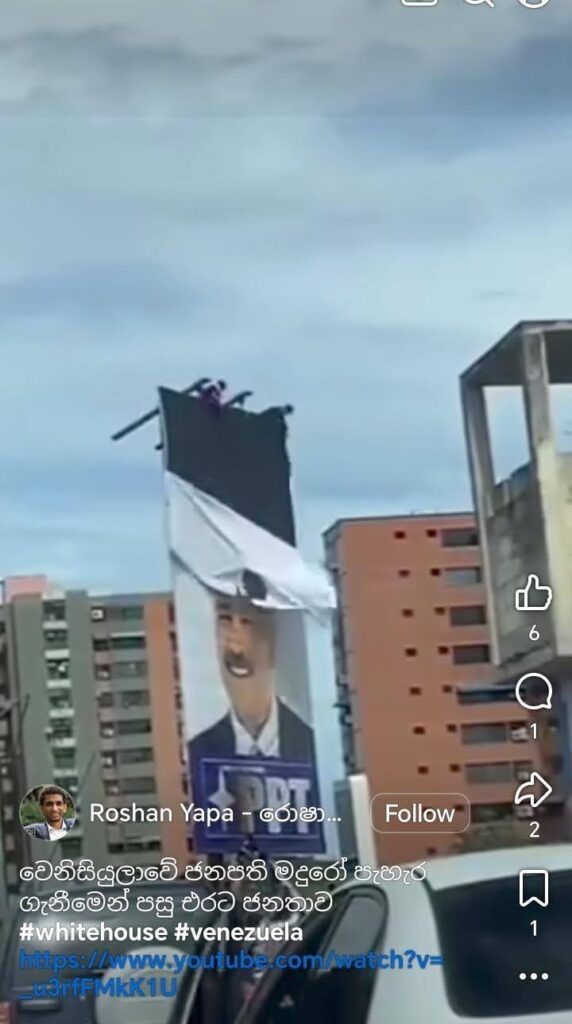 “වෙනිසියුලාවේ ජනපති මදුරෝ අත්අඩංගුවට ගැනීමෙන් පසු එරට ජනතාව” , “මදුරෝ අත්තඩංගුවට ගැනීමෙන් පසු ජනතාව වීදි බසී”  යනාදී තේමා ඔස්සේ කෙටි වීඩියෝවක් සමාජ මාධ්‍ය තුළ හුවමාරු වී තිබුණා.
