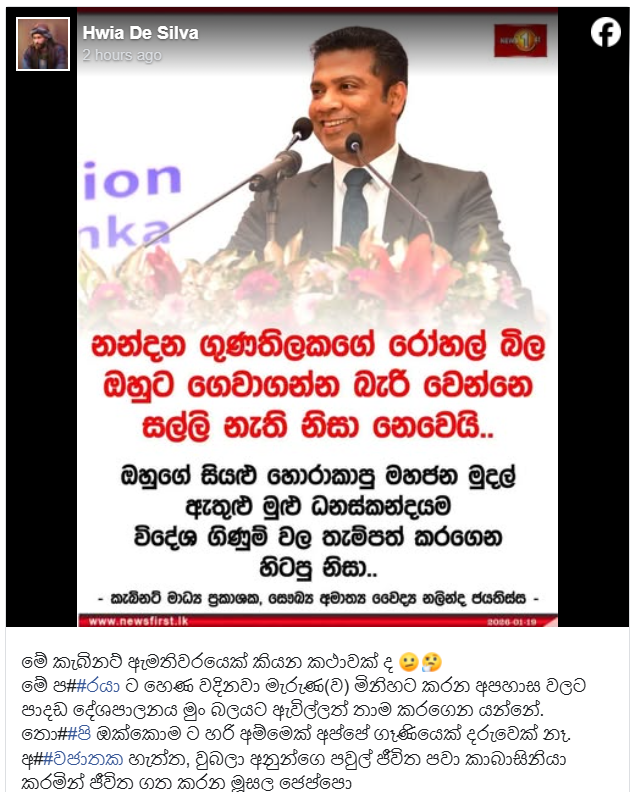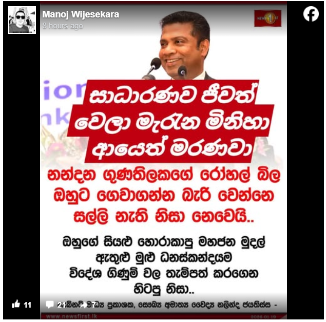 “නන්දන ගුණතිලකගේ රෝහල් බිල ඔහුට ගෙවාගන්න බැරි වෙන්නෙ සල්ලි නැති නිසා නෙවෙයි.ඔහුගේ සියලු හොරාකාපු මහජන මුදල් ඇතුළු මුළු ධනස්කන්දයම විදේශ ගිණුම් වල තැම්පත් කරගෙන හිටපු නිසා.” යනුවෙන් අමාත්ය නලින්ද ජයතිස්ස මහතා සඳහන් කළ බවට දක්වමින් සටහනක් පළ කර තිබුණා.