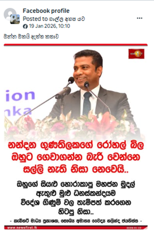 අපගේ විමර්ශනයෙන් පෙන්වා දෙන්නේ, ප්රකට දේශපාලඥයෙකු වන නන්දන ගුණසේන මහතාගේ අභාවයෙන් පසුව, ඔහු ප්රතිකාර ලබා ගත් රෝහලේ බිල ගෙවීමට නොහැකි වූයේ මුදල් නොමැති වීම නිසා නොව ඔහුගේ මුදල් විදේශ ගිණුම් වල තැම්පත් කර ඇති නිසා බවට, අමාත්ය නලින්ද ජයතිස්ස මහතා විසින් ප්රකාශයක් කළ බවට දක්වමින්, සමාජ මාධ්ය ඔස්සේ හුවමාරු වන්නේ News1st ආකෘතිය යොදාගනිමින් සිදුකර ඇති ව්යාජ පුවත් සංස්කරණයක් බවත්, අමාත්යවරයා එවැනි ප්රකාශයක් සිදුකර නොමැති බවයි.