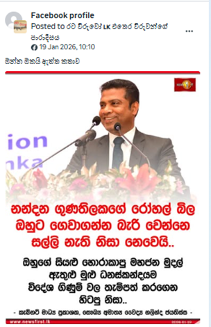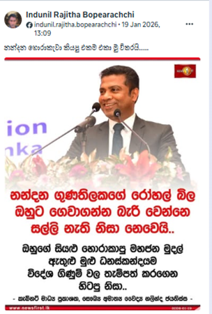 අමාත්යවරයා විසින් “නන්දන ගුණතිලකගේ රෝහල් බිල ඔහුට ගෙවාගන්න බැරි වෙන්නෙ සල්ලි නැති නිසා නෙවෙයි. ඔහුගේ සියලු හොරාකාපු මහජන මුදල් ඇතුළු මුළු ධනස්කන්දයම විදේශ ගිණුම් වල තැම්පත් කරගෙන හිටපු නිසා.” යනුවෙන් බවට වෙනත් ස්ථානයකදී හෝ ප්රකාශයක් සිදු කර නොමැති බවට අප කළ පරීක්ෂාවේදී තහවුරු වුණා.