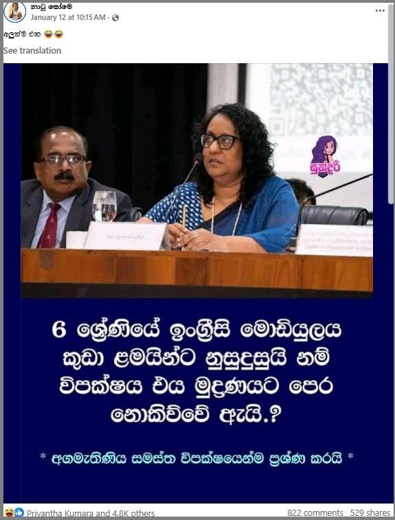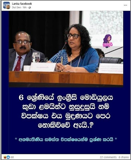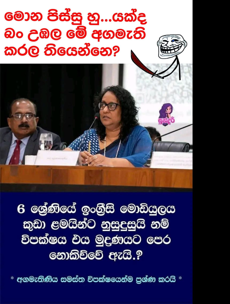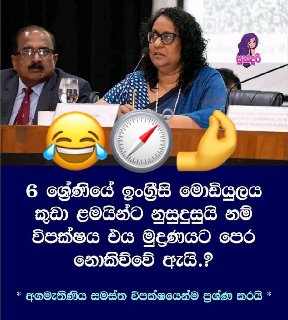 ‘6 ශ්රේණියේ ඉංග්රීසි මොඩියුලය කුඩා ළමයින්ට නුසුදුසුයි නම්, විපක්ෂය එය මුද්රණයට පෙර නොකිව්වේ ඇයි?’ යනුවෙන් අධ්යාපන, උසස් අධ්යාපන සහ වෘත්තීය අධ්යාපන අමාත්ය, අග්රාමාත්ය ආචාර්ය හරිනි අමරසූරිය ප්රකාශයක් සිදු කරමින් විපක්ෂයෙන්ම ප්රශ්න කර ඇති බව කියමින් පළ කර ඇති මෙම ෆේස්බුක් ඔස්සේ සටහන පරිශීලකයින් අතරේ සංසරණය වෙමින් තිබේ.