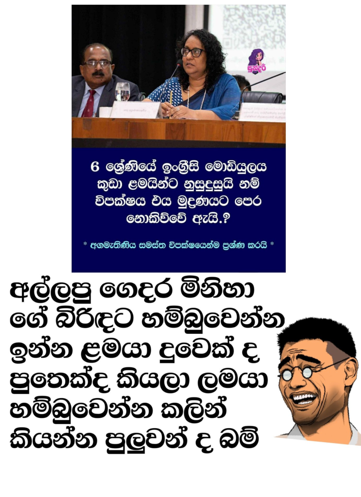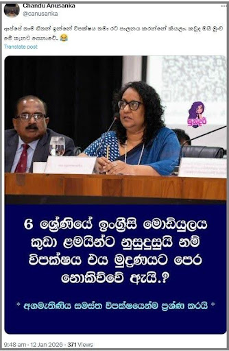 දිට්වා ව්යසනයෙන් පසු රටේ විශේෂ අවධානයක් යොමු වූ 6 ශ්රේණියේ ඉංග්රීසි මොඩියුලය පිළිබඳ ගැටලුව සම්බන්ධව අග්රාමාත්යවරිය විපක්ෂයෙන් ප්රශ්න කර ඇති බවට වන මෙම සමාජ මාධ්ය සටහන් සංසරණය වන්නේ ද එවැනි දේශපාලනික පසුබිමක් තුළදී ය.