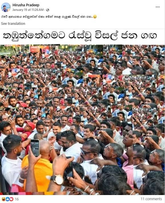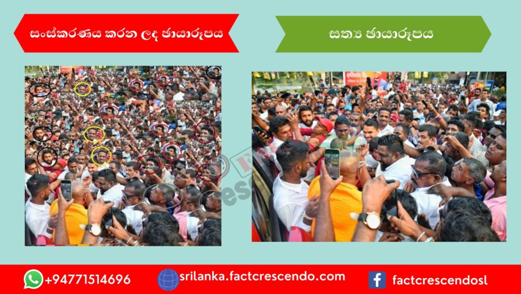 අපගේ කරුණු විමර්ශනයෙන් පෙන්වා දෙන්නේ, ‘තඹුත්තේගමට රැස්වූ විසල් ජන ගඟ‘ යන තේමාවෙන් පළ කර ඇති ඡායාරූපය ශ්රී ලංකා පොදු ජන පෙරමුණු ජන හමුවේ සත්ය ඡායාරූපයක්, කිහිප වරක් ක්ලෝන් කරමින්, සංස්කරණය කරන ලද ඡායරූපයක් බවයි.
