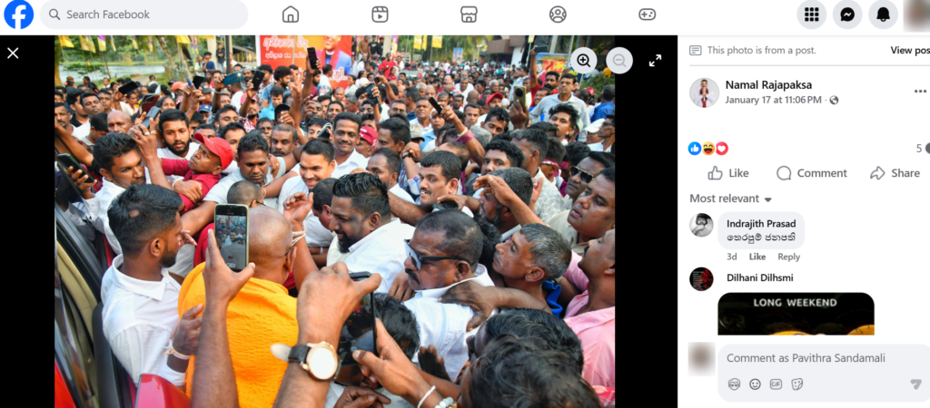 ඒ අනුව මෙහි මුල් ඡායාරූපය සොයා ගැනීම සඳහා අප තවදුරටත් කරුණු පරීක්ෂා කළ අතර එහිදී ශ්රී ලංකා පොදුජන පෙරමුණේ ජාතික සංවිධායක නාමල් රාජපක්ෂ මහතාගේ නිල ෆේස්බුක් ගිණුමේ මෙහි මුල් ඡායාරූපය පළ කර තිබෙනු දැකගත හැකි වුණා.