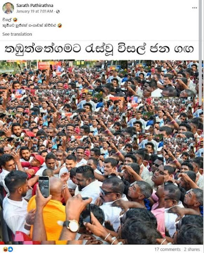 පසුගිය 17 වැනිදා තඹුත්තේගමදී පැවති ශ්රී ලංකා පොදුජන පෙරමුණේ ජන හමුවට ඉහත ඡායාරූපයේ දැක්වෙන ආකාරයේ ජන ගඟක් සහභාගී වී සිටියේ දැයි අප ප්රධාන ධාරාවේ රූපවාහිනී ප්රවෘත්ති ඔස්සේ මූලිකවම පරීක්ෂාවට ලක් කළා.