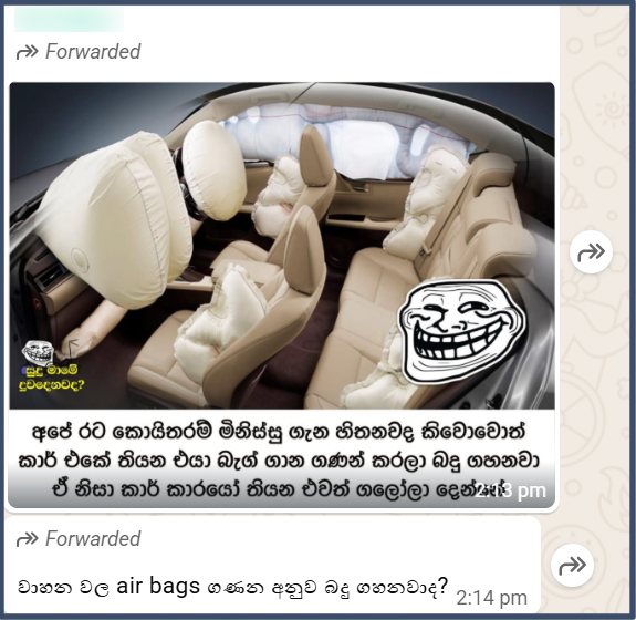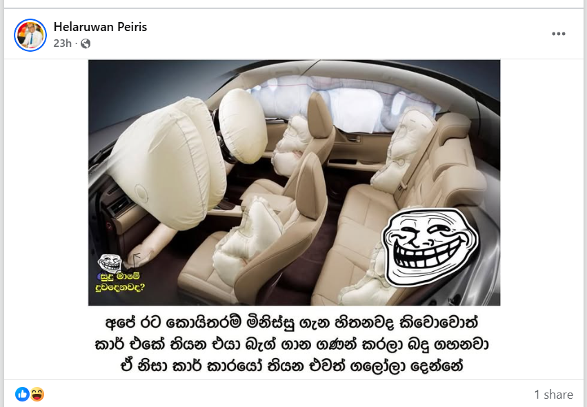 “අපේ රට කොයිතරම් මිනිස්සු ගැන හිතනවද කිව්වොත්, කාර් එකේ තියන එයාබෑග් ගාන ගණන් කරලා බදු ගහනවා. ඒ නිසා කාර් කාරයෝ තියන ඒවත් ගලෝලා දෙන්නේ” යනුවෙන් සඳහන් කරමින් සටහනක් සමාජ මාධ්ය ඔස්සේ සංසරණය වී තිබුණා.