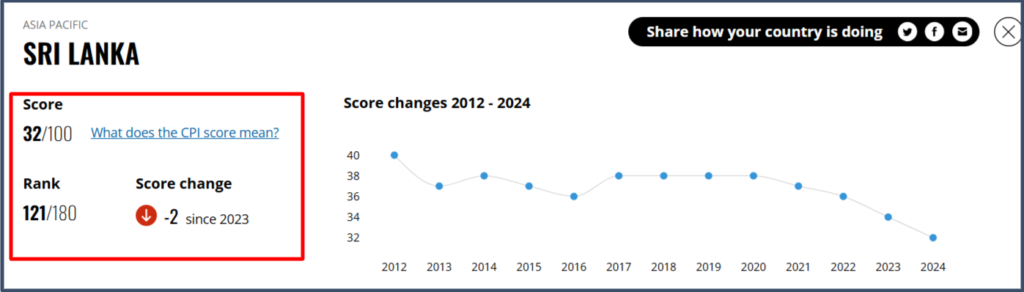 අපගේ විමර්ෂණයෙන් පෙන්වා දෙන්නේ දූෂණය අතින් ශ්රී ලංකාවට 24.7 ක අගයක් ලබා ගෙන තිබෙන්නේ 2025 වසර වෙනුවෙන් World Economics විසින් මෑතක දී පළකර තිබු වාර්තාවකින් නොව, 2024 වසර සඳහා Transparency International ආයතනය පල කර තිබෙන CPI වාර්තාවේ දත්ත මත පදනම්ව නිර්මාණය කර ඇති දර්ශකයක් මගින් ලබාගත් අගයක් බවයි. එම වාර්තාව 2025 වසරේ මුල් භාගයේ සිටම පළකර තිබෙනවා.