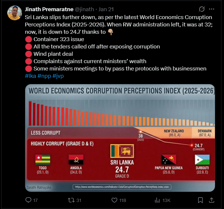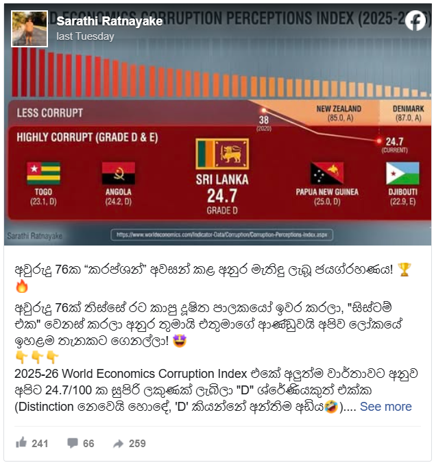 “2025 World Economics Corruption Index හි අලුත්ම වාර්තාවට අනුව අපිට 24.7/100 (Distinction නෙවෙයි හොඳේ, ‘D’ කියන්නේ අන්තිම අඩිය. ( 2024 32/100% තිබ්බ අගය මේ අවුරැද්දේ 24.7% ට බැස ඇත).අන්ත දූශිතයැයි පවසන රාජපක්ශ සමයේ ලංකාව ලෝකයේ දූශනය අවම රටවල් අතර 87 වන ස්ථානයේ පැවති අතර වර්ථමානයේ 121 වෙනි ස්ථානයේ පසුවෙයි” යනුවෙන් සඳහන් කරමින් සමාජ මාධ්ය සටහනක් පල වී තිබුණා.