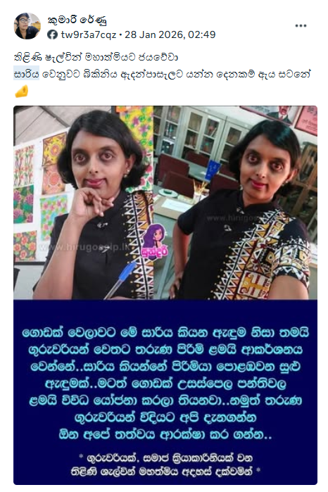 කොළඹ ප්රධාන පාසලක ප්රධාන ශිෂ්ය නායකයා හා ගුරුවරියන් තිදෙනෙකුගේ නුසුදුසු වීඩියෝ කිහිපයක් සමාජ මාධ්ය ඔස්සේ බහුලව සංසරණය වී ඇති පසුබිමක සහ ගුරුවරියන්ගේ සාරිය වෙනුවට වෙනත් විකල්ප ඇඳුම් භාවිතය පිළිබඳ සමාජ මාධ්ය ඔස්සේ හඬ නැගූ ගුරුවරියක් ලෙසට හඳුනා ගත් තිළිණි ශැල්වින් ගුරුවරිය විසින් මේ ආකාරයෙන් ප්රකාශයක් කළ බවට දක්වා තිබුණේ. ඇය විසින් සත්ය වශයෙන් ම එවැනි ප්රකාශයක් කර තිබුණේ ද, යන්න ඇයගේ නිල ෆේස්බුක් ගිණුම හරහා අප ප්රථමයෙන් ම පරීක්ෂා කරනු ලැබුවා. නමුත් ඇය විසින් ඒ ආකාරයෙන් ප්රකාශයක් කළ බවට සටහනක් දැක ගන්නට නොලැබේ.