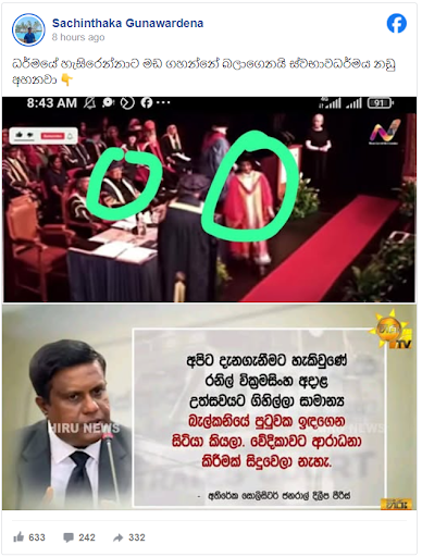 අපගේ කරුණු විමර්ෂණයෙන් පෙන්වා දෙන්නේ මහාචාර්ය මෛත්රී වික්රමසිංහ සිය උපාධි සහතිකය ලබාගන්නා අවස්ථාවේදී රනිල් වික්රමසිංහ මහතා ඉදිරිපෙළ අසුනක වාඩිවී සිටි බව හඟවමින් හුවමාරු වන්නේ නොමඟ යවන සුළු සටහන් පෙළක් බවයි.