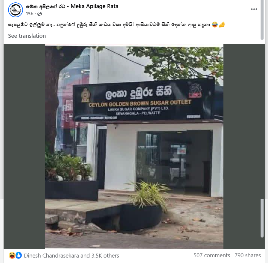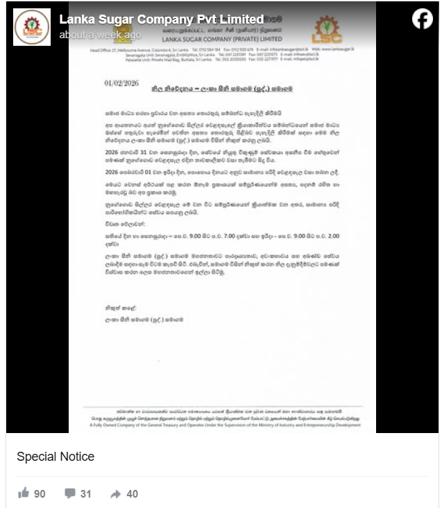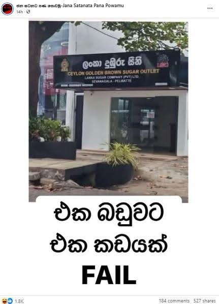ඉල්ලුමට සරින සැපයුමක් නොමැතිවීම හමුවේ කර්මාන්ත හා ව්යවසාය සංවර්ධන අමාත්යාංශය යටතේ ක්රියාත්මක වන ලංකා සීනි සමාගමේ නුගේගොඩ දුඹුරු සීනි අලෙවිසැල වසා දමා ඇති බව කියමින් මෙම සටහන පළ කර තිබුණා.