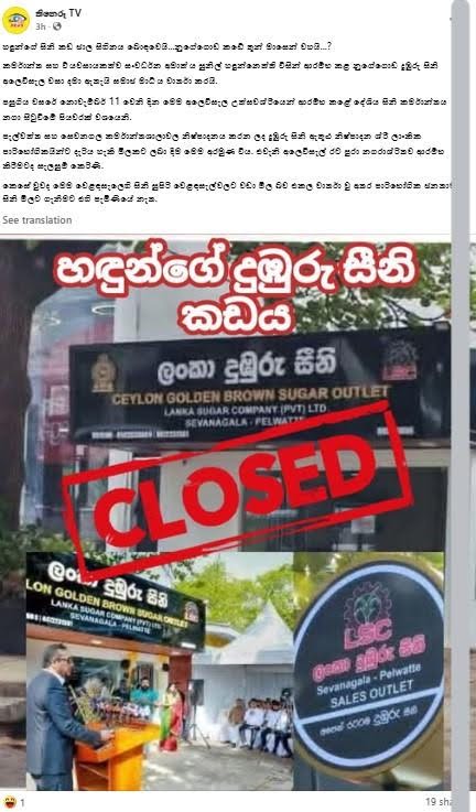 අපේ කරුණු විමර්ශනයෙන් පෙන්වා දෙන්නේ, ලංකා සීනි සමාගම යටතේ ක්රියාත්මක නුගේගොඩ දුඹුරු සීනි අලෙවිසැල වසා දමා ඇති බවට සමාජ මාධ්ය ඔස්සේ සංසරණය වන සටහන් සම්පූර්ණයෙන් අසත්ය බවයි. සීනි අලෙවිසැල වසා දමා ඇති බවට වන සමාජ මාධ්ය සටහන් සඳහා පාදක වී ඇත්තේ, පසුගිය 31 වන සෙනසුරාදා එහි සේවකයා හදිසියේම අසනීප වීම නිසා අලෙවිසැල තාවකාලිකව වසා දැමීමට සිදුවීමයි.