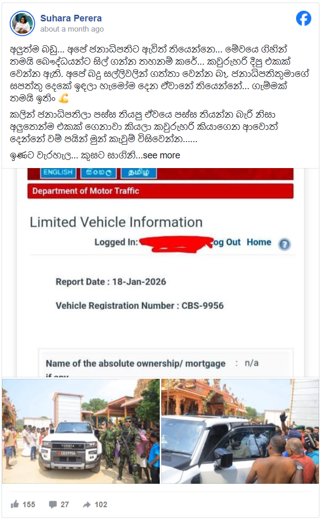 ජනාධිපතිවරයාගේ අලුත්ම රථය බව කියමින් සමාජ මාධ්ය ඔස්සේ සංසරණය වන ඡායාරූපවල දැක්වෙන රථය නාගදීප විහාරාධිපති හිමියන්ගේ නාගදීප විහාරාධිපති හිමියන්ගේ ෆේස්බුක් ගිණුම පරීක්ෂා කිරීමේදීද තහවුරු වේ. ජනවාරි 22 වනදා විහාරධිපති හිමියන්ගේ සිය රථය අසල පෙනී සිටින ඡායාරූපයක් මෙලෙස ෆේස්බුක් ඔස්සේ පළ කර තිබුණා.