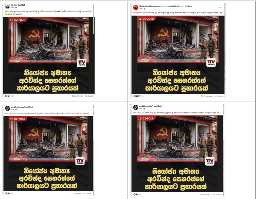 පොරොන්දු ඉටු නොකළ බවට චෝදනා කරමින් ප්රදේශවාසීන් රටේ කිසියම් හෝ ස්ථානයක දේශපාලන කාර්යාලයක් සමාජ මාධ්යයේ සංසරණය වන සටහන්වල දැක්වෙන පරිදි ගිනිතබා විනාශ කර තිබේ නම්, එවැනි ප්රවෘත්තියක් මෙරට ප්රධාන ධාරාවේ මාධ්ය නාලිකා සියල්ලක්ම විසින් වාර්තා කර තිබිය යුතු නමුත් ප්රධාන ධාරාවේ කිසිදු මාධ්යක් සමාජ මාධ්ය සටහන්වල දැක්වෙන ආකාරයේ පුවතක් වාර්තා කර නොමැත.
