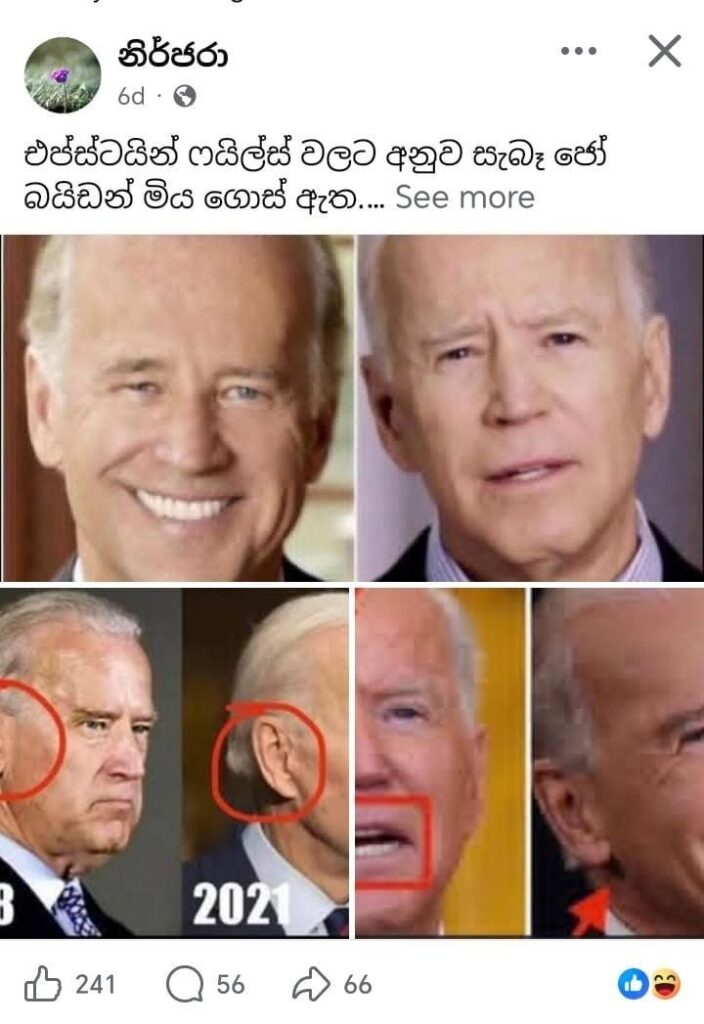 ජෙෆ්රි එප්ස්ටීන් ගොනු වලට අනුව සැබෑ ජෝ බයිඩන් මිය ගොස් ඇති බවට දක්වමින් සමාජ මාධ්ය තුළ පළ වී තිබූ අතර ඒ පිළිබඳ Factcrescendo අප සිදු කරන ලද කරුණු පරීක්ෂාවක් පහතින්.