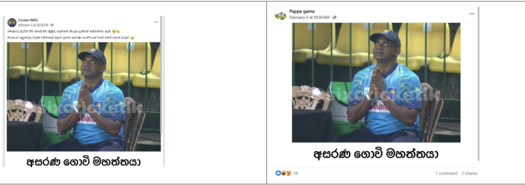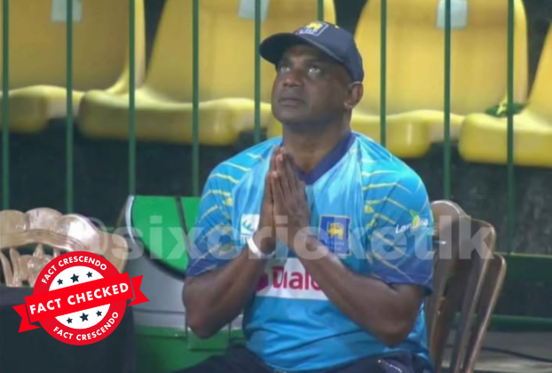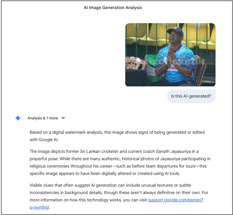 අපගේ කරුණු විමර්ශනයෙන් පෙන්වා දෙන්නේ, ශ්රී ලංකා කණ්ඩායම ජයග්රහණය කර දෙන මෙන් ඉල්ලමින් පුහුණුකාර සනත් ජයසූරිය දෑත් එක් කර අහස දෙස බලමින් දෙවියන් යදින බව කියමින් සමාජ මාධ්ය ජාලා ඔස්සේ සංසරණය වන ඡායාරූපය කෘත්රිම බුද්ධිය (AI) ඔස්සේ සංස්කරණය කරන ලද ඡායාරූපයක් බවයි. මේ අතර සමාජ මාධ්යයේ සංසරණය වන ඡායාරූපය, ලෝක කුසලානයට පෙර එංගලන්ත කණ්ඩායම සමග පැවති 20 යි 20 දෙවැනි තරගයේදී මතීෂ පෙරේරා එංගලන්ත නායක හැරී බෘෘක්ගේ කඩුල්ල බිඳ දැමීමෙන් පසු සනත් ජයසූරිය සතුට මුසු වූ නොසන්සුන්බවක් පෙන්නුම් කරන අවස්ථාවේ දර්ශනයෙන් උපුටා ගන්නා ලද ඡායාරූපයක් සංස්කරණය කරමින් සමාජ මාධ්යයේ පළ කරන ලද්දකි.