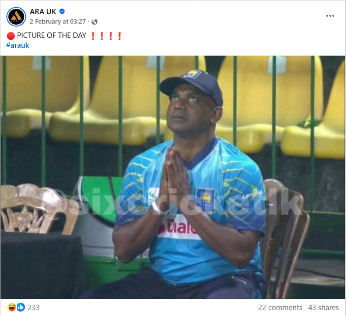 අසරණ ගොවි මහතා යන සඳහන සහිතව පෙබරවාරි 02 වැනිදා ෆේස්බුක් වෙත මුදා හැර ඇති මෙම ඡායාරූපයට අනුව ශ්රී ලංකා ක්රිකට් පුහුණුකරු, හිටපු තුන්ඉරියව් ක්රීඩක සනත් ජයසූරිය ක්රිකට් තරගයක් අතරතුර දෑත් එකතු කර උඩබලාගෙන වඳිමින් යමක් ඉටුකර දෙනමෙන් දෙවියන් යදින ආකාරයක් දිස් වේ.