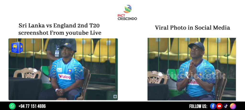 සමාජ මාධ්ය ඔස්සේ සංසරණය වන ඡායාරූපය පෙබරවාරි 02 වැනි දා පළ කර ඇති බැවින් මෙම ඡායාරූපය ශ්රී ලංකාවේ සහ ඉන්දියාවේ සමසත්කාරකත්වයෙන් පෙබරවාරි 07 වැනිදා ආරම්භ වූ T20 ලෝක කුසලානයේ තරගයකට අදාළ ඡායාරූපයක් විය නොහැකියි. එකී අනුමානය මත පිහිටා අප ඊට පෙර පැවති සංචාරක එංගලන්ත කණ්ඩායම සහ ශ්රී ලංකාව අතර පල්ලෙකැලේ ක්රීඩාංගණයේදී පැවති තරග 3කින් සමන්විත T20 තරගාවලිය වෙත අවධානය යොමු කළේ ය. ඒ අනුව එංගලන්ත කණ්ඩායමට එරෙහිව පෙබරවාරි 02 වැනිදා පැවති දෙවැනි තරගයේ දර්ශන සමීපව නිරීක්ෂණය කිරීමට අප පියවර ගත්තා. එම දර්ශනවලට අනුව ශ්රී ලංකා පන්දු යවන ක්රීඩක මතීෂ පතිරණ 13 වැනි පන්දුවාරයේදී එංගලන්ත නායක හැරී බෘෘක්ගේ කඩුල්ල දවා ගන්නා අතර එම දැවීයාමෙන් පසු කැමරාව ශ්රී ලංකා පුහුණුකරු සනත් ජයසූරිය වෙතට යොමුවේ. එහිදී ඔහුගේ මුහුණේ ඉරියව් අනුවෙ, සතුට මුසු වූ නොසන්සුන්බවක් පෙන්නුම් කරන අතර හැරී බෘෘක් දැවී යාමට පෙර මතීෂ යොමු කළ පන්දු දෙකටම බෘෘක් විසින් 6 පහර දෙකක් එල්ලකර තිබීම නිසා සනත් ජයසූරියගෙන් එවැනි ප්රකාශනයක් සිදුවූවා විය හැකියි.