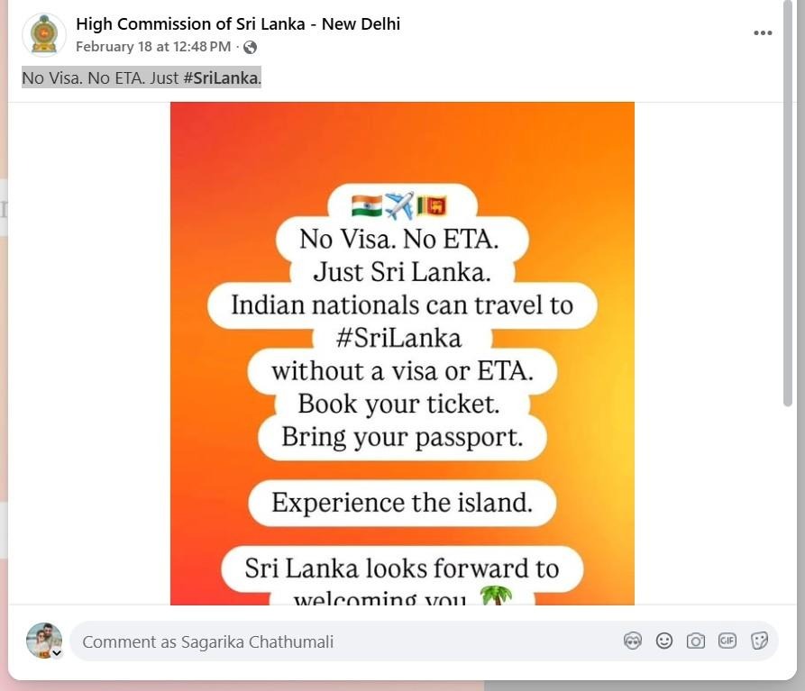 වීසා අවශ්ය නැත. විද්යුත් සංචාරක අවසරය (ETA) අවශ්ය නැත. යන තේමාවෙන් පෙබරවාරි 19 වැනිදා පළ කර ඇති පහත සටහනේ දැක්වෙන්නේ, වීසා හෝ විද්යුත් සංචාරක අවසරය නොමැතිව ඉන්දීය ජාතිකයින්ට ශ්රී ලංකාවට පැමිණීමට හැකි බවයි. තව ද මෙම සටහන පළ කර ඇත්තේ, මෙය ඉන්දියාවේ ශ්රී ලංකා මහකොමසාරිස් මහීෂිනී කොලොන්නේ ප්රකාශ කර ඇති බව පවසමිනි.