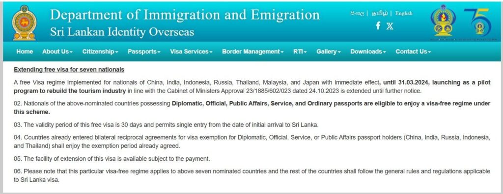 2024.03.31 දක්වා ක්රියාත්මක කිරීම සඳහා 2023.10.24 වැනිදා කැබිනට් අනුමැතිය හිමි වූ ඉන්දියාව, චීනය, රුසියාව, මැලේසියාව, ජපානය, ඉන්දුනීසියාව සහ තායිලන්තය යන රටවල් 7 සඳහා නොමිලේ සංචාරක වීසා නිකුත් කිරීම නැවත දැනුම් දෙනතුරු දීර්ඝ කර ඇති බව ආගමන විගමන දෙපාර්තමේන්තු වෙබ් අඩවියේ මෙලෙස සඳහන්ව ඇත.
