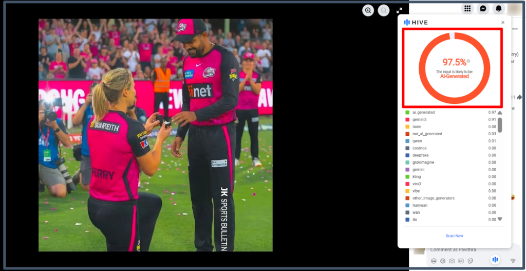 කෙසේ වෙතත් මෙම ඡායාරූපයේ ඇති අස්වාභාවික බව මත අප මෙම ඡායාරූපය කෘතිම බුද්ධිය ඔස්සේ ජනනය කර ඇත්ද යන්න, ඒවා පරීක්ෂා කිරීමේ මෙවලමක් හරහා පරීක්ෂා කළ අතර මෙම ඡායාරූප කෘතිම බුද්ධිය ඔස්සේ ජනනය කර ඇති බවට ප්රතිඵල ලැබී තිබුණේ මෙලෙසින්.