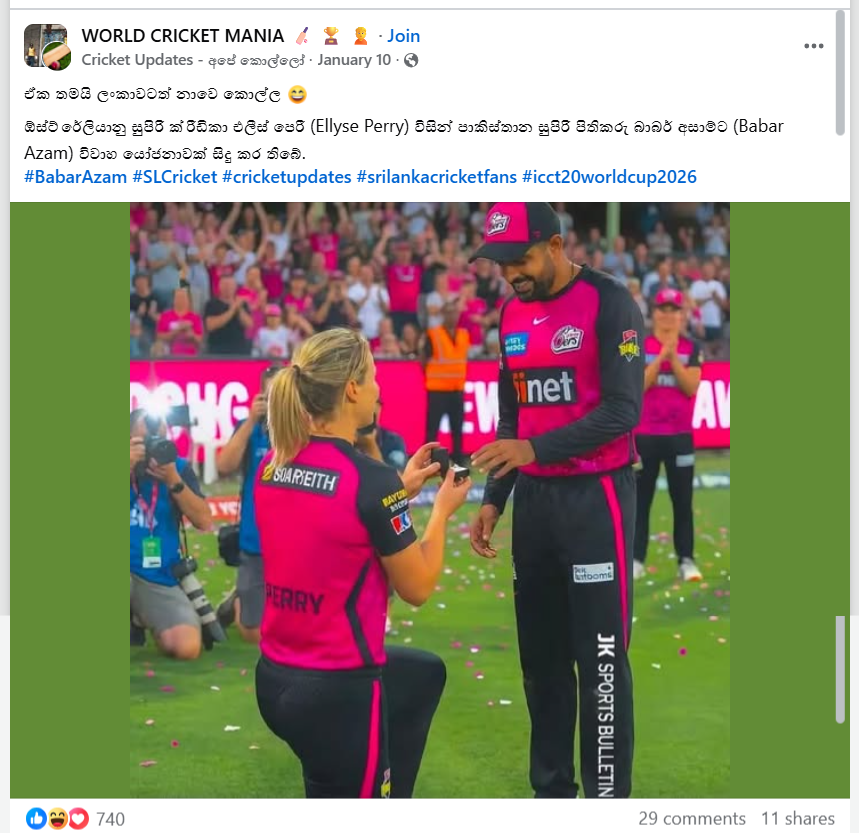 තවත් සටහනක පළ වූයේ, ඕස්ට්රේලියානු සුපිරි ක්රීඩිකා එලීස් පෙරී (Ellyse Perry) විසින් පාකිස්තාන සුපිරි පිතිකරු බාබර් අසාම්ට (Babar Azam) විවාහ යෝජනාවක් සිදු කර ඇති බවයි. එම අවස්ථාවේ ඡායාරූපයක් බවට ඡායාරූපයක් ද, පළ කර තිබුණා.