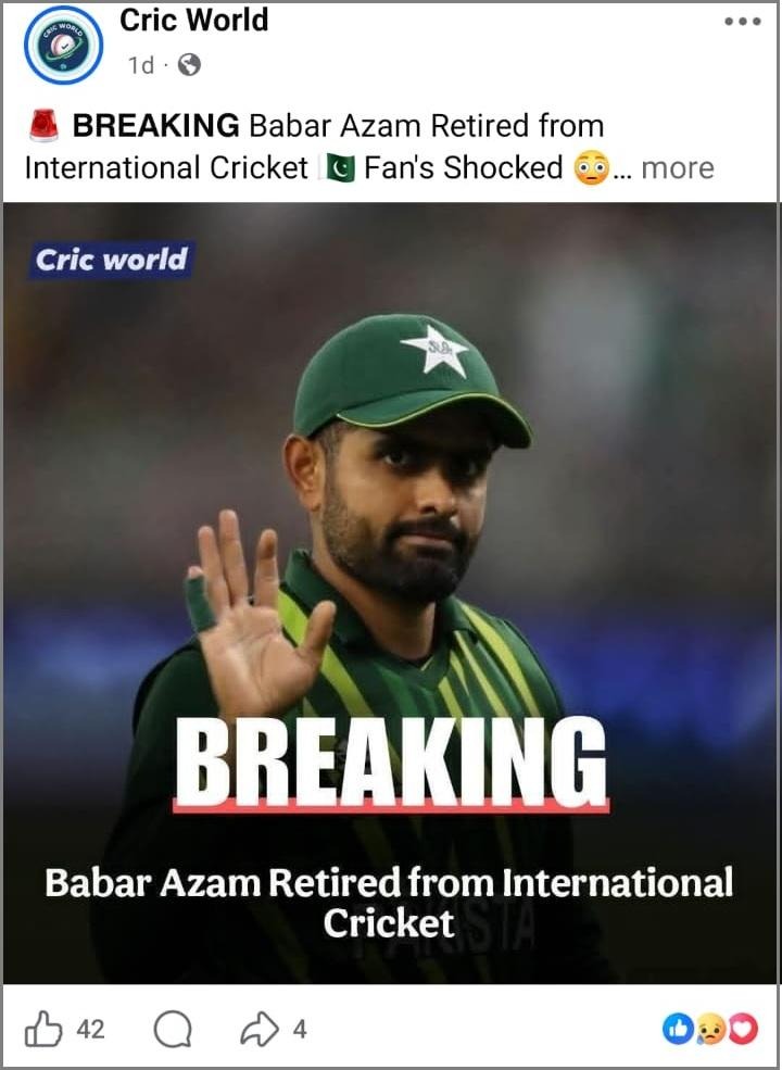 අපගේ කරුණු විමර්ශනයෙන් පෙන්වා දෙන්නේ, පාකිස්ථාන ක්රිකට් ක්රීඩක බාබර් අසාම් ජාත්යන්තර ක්රිකට් පිටියෙන් සමුගන්නා බවට නිල වශයෙන් නිවේදනය කර නොමැති බවයි. අසාම් ජාත්යන්තර පිටියෙන් සමුගන්නා බවට සමාජ මාධ්යයේ සංසරණය වන සටහන් කිසිදු නිර්වද්යතාවක් නොමැති අසත්ය සටහන්වේ.
