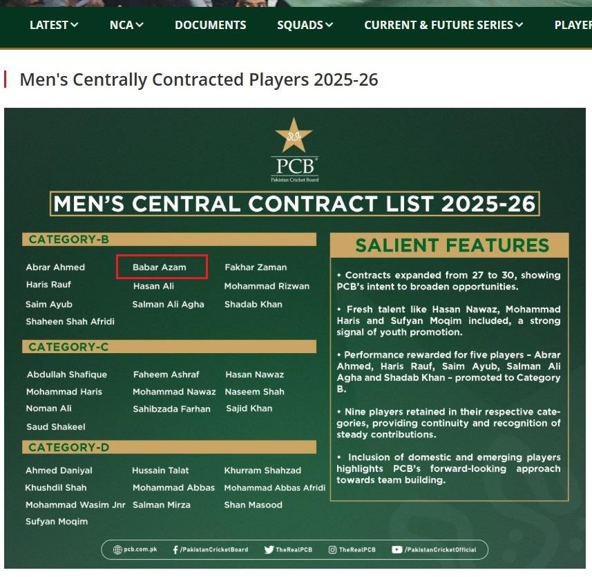 සමාජ මාධ්ය සටහන්වල නිර්වද්යතාව තවදුරටත් තහවුරු කර ගැනීම සඳහා අප පාකිස්ථාන ක්රිකට් පාලක මණ්ඩලයේ (PCB) නිල වෙබ් අඩවිය සහ එහි සමාජ මාධ්ය ගිණුම් Facebook , X ද පරීක්ෂාවට ලක් කළා. නිල වෙබ් අඩවියේ හෝ එහි සමාජ මාධ්ය ගිණුම්වල හෝ බාබර් අසාම් ජාත්යන්තර පිටියෙන් සමුගැනීමට තීරණයක් පිළිබඳව නිවේදනය කර නොමැත. මේ අතර පාකිස්ථාන වෙබ් අඩවියට අනුව බාබර් අසාම් පාකිස්ථාන ටෙස්ට්, එක්දින සහ T20 සංචිත තුනම නියෝජනය කරන ක්රීඩකයෙකු වන අතර පකිස්ථාන ක්රිකට් පාලක මණ්ඩලය විසින් නිකුත් කරනු ලබන Men’s Centrally Contracted Players 2025-26 ලැයිස්තුව මගින් ද ඔහු තවදුරටත් ජාතික කණ්ඩායම නියෝජනය කරන ක්රීඩකයෙකු බව සඳහන් කර තිබේ.