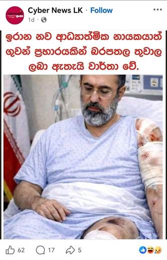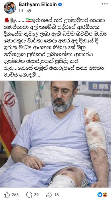 “ඉරානයේ නව උත්තරීතර නායක මොජ්තාබා අල් කමේනි යුද්ධයේ ආරම්භක දිනයේම තුවාල ලබා ඇති බවට බටහිර මාධ්ය තොරතුරු වාර්තා කෙරූ අතර අද දිනයේ දි ඉරාන මාධ්ය ආයතන කිහිපයක් ඔහු රෝහලක ප්රතිකාර ලබාගන්නා ආකාරය දැක්වෙන ඡායාරූපයක් ප්රසිද්ද කර ඇත… ” යනුවෙන් සඳහන් කරමින් ඡායාරූපයක් සමාජ මාධ්ය තුළ හුවමාරු වී තිබුණේ මෙලෙසින්.