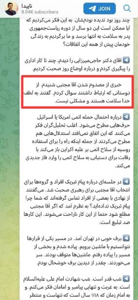 “මොජ්තාබා මහතාට තුවාල සිදුවී ඇති බවට පුවත් මට අසන්නට ලැබුණා. මම ඒ සම්බන්ධයෙන් ඔහු සමඟ සබඳතා ඇති මිතුරන්ගෙන් විමසා බැලුවා. දෙවියන්ට ස්තූති වන්නට ඔහු සුවෙන් පසුවන බවත්, කිසිදු ගැටලුවක් නොමැති බවත් ඔවුන් මට පැවසුවා” යනුවෙනි.
