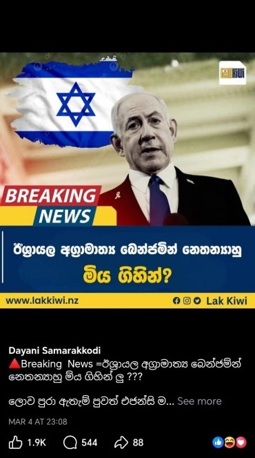 “ඊශ්රායල අග්රාමාත්ය බෙන්ජම්න් නෙතන්යාහු ම්ය ගිහින් ලු. ලොව පුරා ඇතැම් පුවත් එජන්සි මෙම තහවුරු නොකළ පුවතට අත් තටු ලබා දී තිබෙනවා” යනුවෙන් සඳහන් කරමින් සටහනක් සමාජ මාධ්ය ඔස්සේ පල වී තිබුණේ මෙලෙසින්.