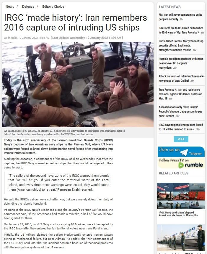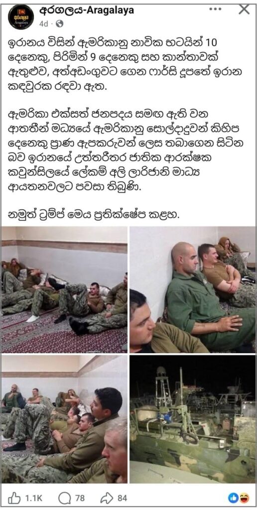 ඒ අනුව සමාජ මාධ්‍ය ඔස්සේ, මේ වනවිට පවතින යුද්ධයට අදාළව ඉරානය විසින් අමෙරිකානු සෙබළුන් අත්අඩංගුවට ගෙන ඇති බව කියමින් සමාජ මාධ්‍යයේ සංසරණය වන්නේ, 2016 වසරේ සිදුවීමට අදාළව ඉරානය විසින් නිකුත් කර තිබූ දර්ශන සහ ඡායාරූපයි.