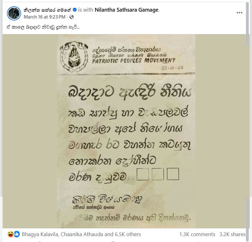 බදාදාට ඇඳිරි නීතිය කඩ සාප්පු හා වැඩපලවල් වහපල්ලා අපේ නියෝගය මගහැර රට වහන්න කටයුතු නොකරන ද්රෝහීන්ට මරණ දඬුවම ජවිපෙ සන්නද්ධ අංශ කීර්ති විජයබාහු විසින් කළ නිවේදනයක් බවට දක්වමින් ඡායාරූප සසටහනක් සංසරණය වුණා.