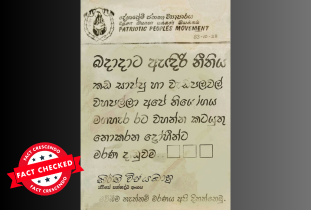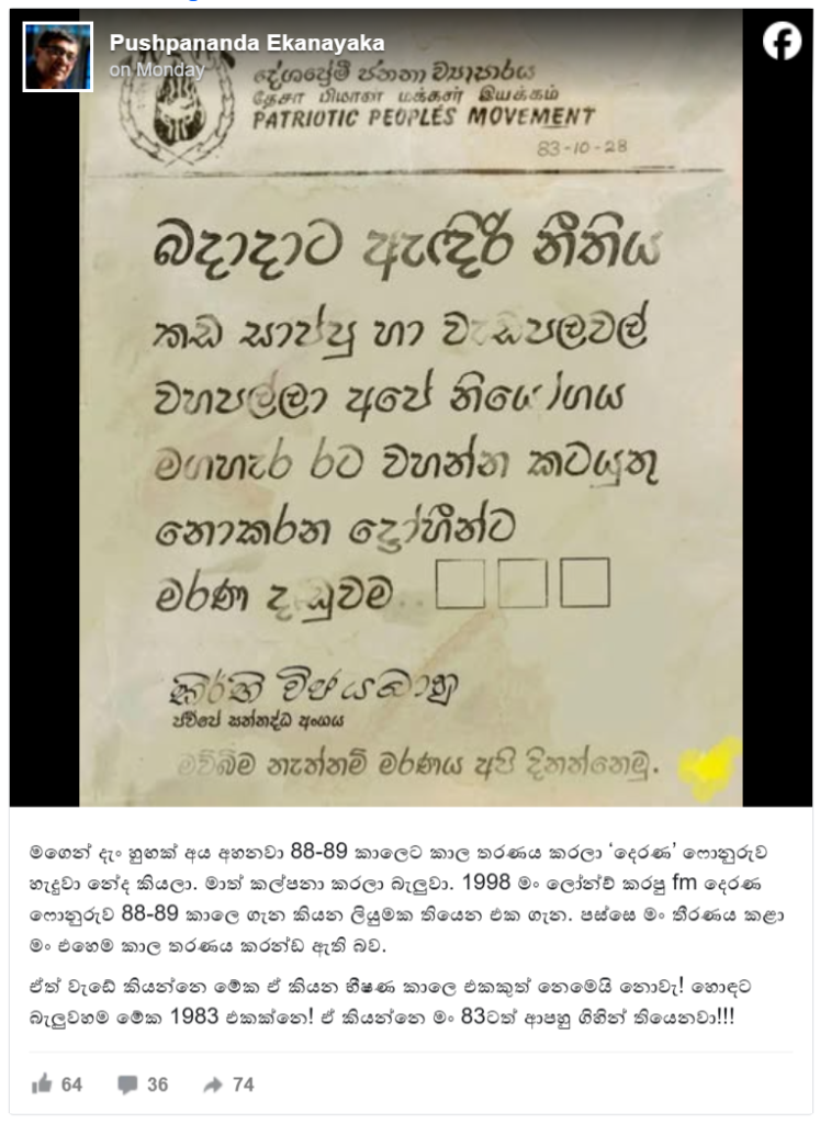 මෙම ඡායාරූපය , ජනතා විමුක්ති පෙරමුණ (ජේවීපී) යුගයේ, විශේෂයෙන් 1987–1989 කැරැල්ල ආරම්භයට පෙර 1983 ජේවීපී ය නිකුත් කළ නිවේදනයක් ලෙසින් පෙන්වා දීමට කටයුතු කර ඇති බවට දැක ගන්නට ලැබෙනවා. නමුත් මෙම නිවේදනය සඳහා යොදාගෙන ඇති අකුරු වර්ගය FM Derana බවට දැක ගන්නට ලැබෙන අතර එය 1998 වසරේදී හඳුන්වා දුන් අකුරු වර්ගයක් බැවින් මෙය එවකට නිකුත් කර නිවේදනයක් නොවන බවට තහවුරු වේ.