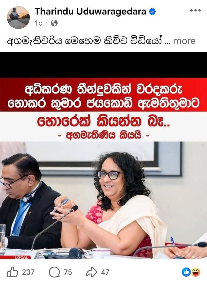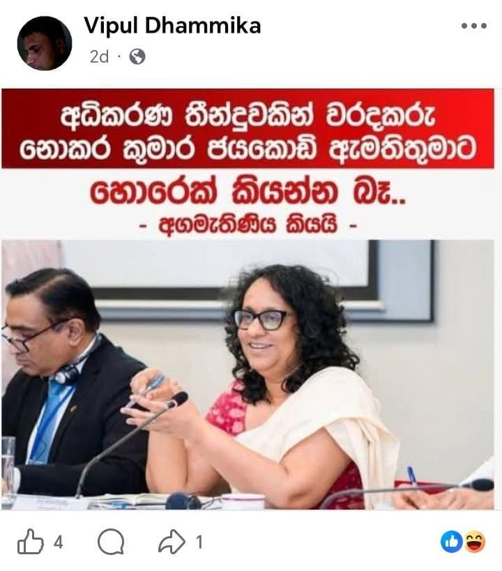 ” අධිකරණ තීන්දුවකින් වරදකරු නොකර කුමාර ජයකොඩි ඇමැතිතුමාට හොරෙක් කියන්න බෑ – අගමැතිනිය කියයි” යනුවෙන් සඳහන් කරමින් සමාජ මාධ්ය සටහනක් පළ වී තිබුණේ මෙලෙසින්.