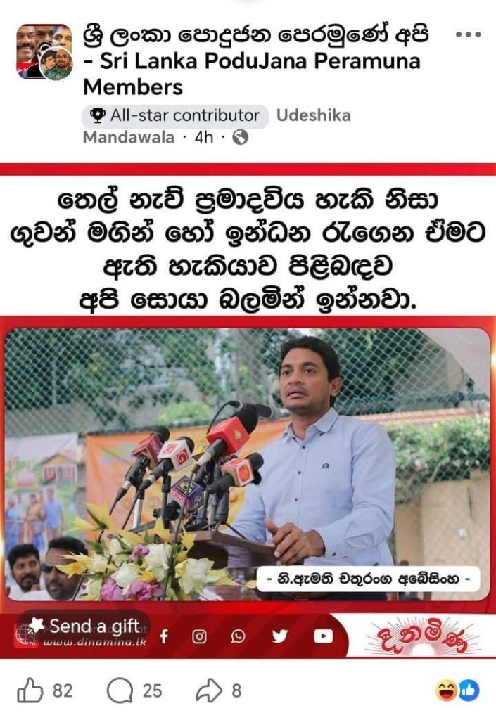 “තෙල් නැව් ප්රමාද විය හැකි නිසා ගුවන් මගින් හෝ ඉන්ධන රැගෙන ඒමට ඇති හැකියාව පිළිබඳව අපි සොයා බලමින් ඉන්නවා – නියෝජ්ය ඇමති චතුරංග අබේසිංහ” යනුවෙන් සඳහන් කරමින් සමාජ මාධ්ය සටහනක් පළවී තිබුණේ මෙලෙසින්.