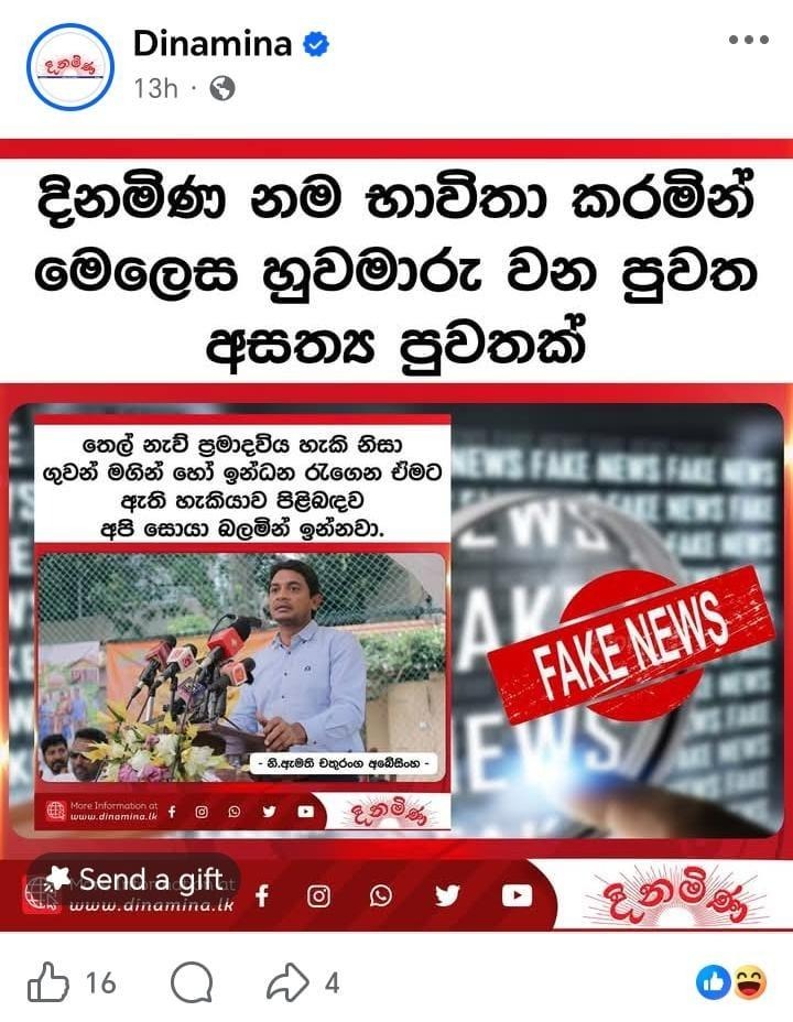 අදාළ සමාජ මාධ්ය සටහන දිනමිණ නම භාවිතා කරමින් හුවමාරු වන අසත්ය පුවතක් බව තහවුරු කරමින් දිනමිණ පුවත්පත මගින් සමාජ සටහනක් පල කර තිබුණේ මෙලෙසින්.