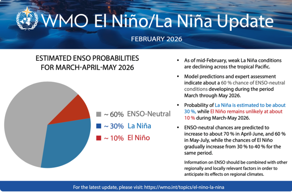World Meteorological Organization (WMO) 2026 පෙබරවාරි මාසයේදී නිකුත් කරන ලද යාවත්කාලීන කිරීම්වලට අනුව මාර්තු සිට මැයි දක්වා කාලය තුළ එල් නිනෝ තත්ත්වයක් ඇතිවීමේ අවදානම 10% පමණි. ලා නිනා තත්ත්වය දුර්වල වෙමින් පවතින අතර ඉදිරි මාසවලදී එල් නිනෝ අවදානම ක්රමයෙන් වැඩිවිය හැකි නමුත් එය තවමත් නිශ්චිත නොවන බව ඉහත වාර්තාව මගින් වැඩිදුරටත් පැවසේ.