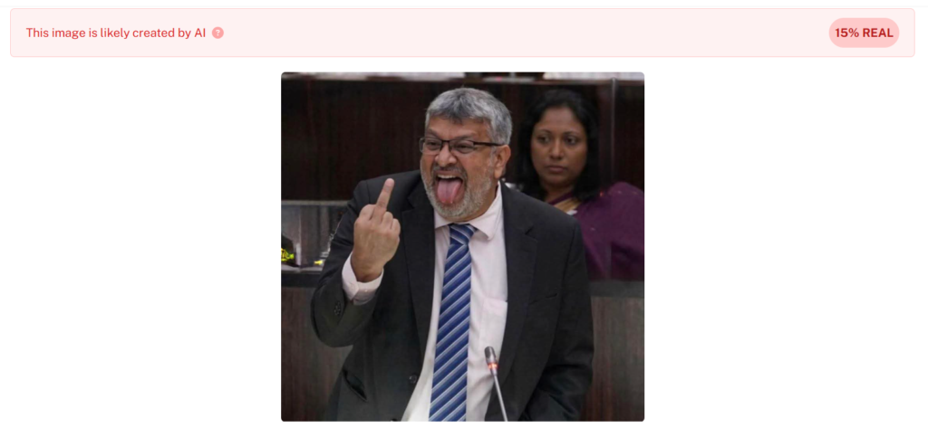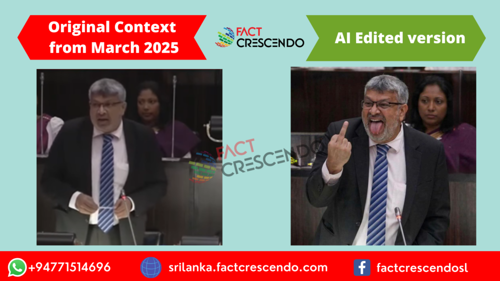 අපගේ කරුණු විමර්ෂණයෙන් පෙන්වා දෙන්නේ අධිකරණ සහ ජාතික ඒකාබද්ධතා අමාත්ය, නීතීඥ හර්ෂණ නානායක්කාර මහතා විසින් පාර්ලිමේන්තුව තුළ අපහාසාත්මක අභිනයක් සිදු කළ අවස්ථාවක් බවට දක්වමින් හුවමාරු වන ඡායාරූපය, මීට වසරකට පෙර පාර්ලිමේන්තුවේ සිදුවූ කතාවකදී ලබාගත් දර්ශන යොදාගනිමින්, කෘත්රිම බුද්ධිය ඔස්සේ නිර්මාණය කරන ලද ඡායාරූපයක් බවයි.