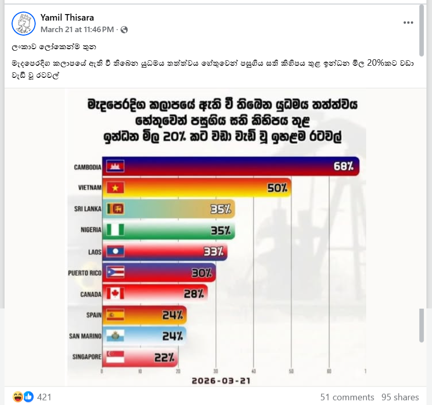 ඉහත ප්රස්ථාරයේ දැක්වෙන්නේ, 2026-03-21 දින වනවිට මැදපෙරදිග කලාපයේ පවතින යුද උණුසුම හේතුවෙන් ගෝලීය තෙල් සැපයුමට බාධා එල්ල වීම මත අදාළ රටවල ඉන්ධන මිල ඉහළ ගිය තත්ත්වයයි.