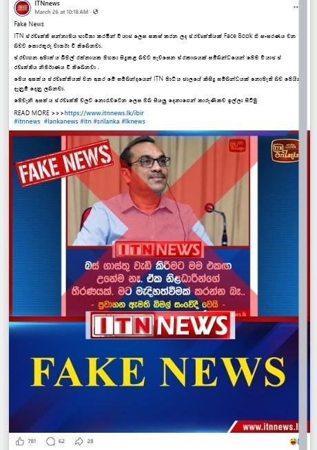 අමාත්යවරය සිදු කර ඇති බව කියන අදාළ ප්රකාශය ස්වධීන රූපවාහිනී පුවත් ෆේස්බුක් පිටුවේ පළ කර නොමැති බව අප සිදු කළ පරීක්ෂාවේදී අනාවරණය විය. මේ අතර ITN ප්රවෘත්ති සිය නිල ෆේස්බුක් පිටුවේ සටහනක් තබමින් පවසා තිබුණේ, සමාජ මාධ්යයේ සංසරණය වන ආකාරයේ සටහනක් නිල ෆේස්බුක් පිටුවේ පළ නොකළ බවත් එය ITN ප්රවෘත්ති සන්නාමය භාවිත කරමින් ව්යාජ ලෙස සකස් කරන ලද සටහනක් බවත් ය.