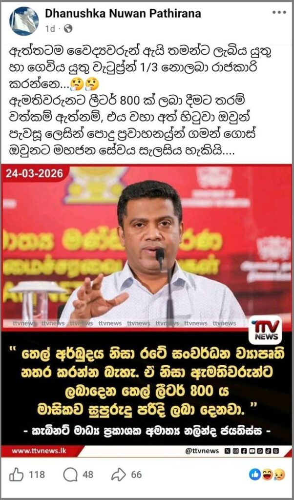 තෙල් අර්බුදය නිසා රටේ සංවර්ධන ව්යාපෘති නතර කිරීමට නොහැකි බවත් ඒ අනුව අමාත්යවරුන්ට ලබා දෙන ඉන්ධන ලීටර් 800 මාසිකව සුපුරුදු පරිදි ලබා දෙන බවට කැබිනට් ප්රකාශක අමාත්ය නලින් ද ජයතිස්ස මහතා ප්රකාශ කර ඇතැයි කියමින් මෙම සටහන සමාජ මාධ්ය ඔස්සේ හුවමාරු වී තිබේ. අමාත්යවරයා සිදු කර ඇතැයි කියමින් එම ප්රකාශය පළ කර ඇත්තේ, TTVnews ෆේස්බුක් පිටුවේ මාර්තු 24 වනදා පළ කරන ලද සටහනක් බවට හැඟී යන ආකාරයටයි.